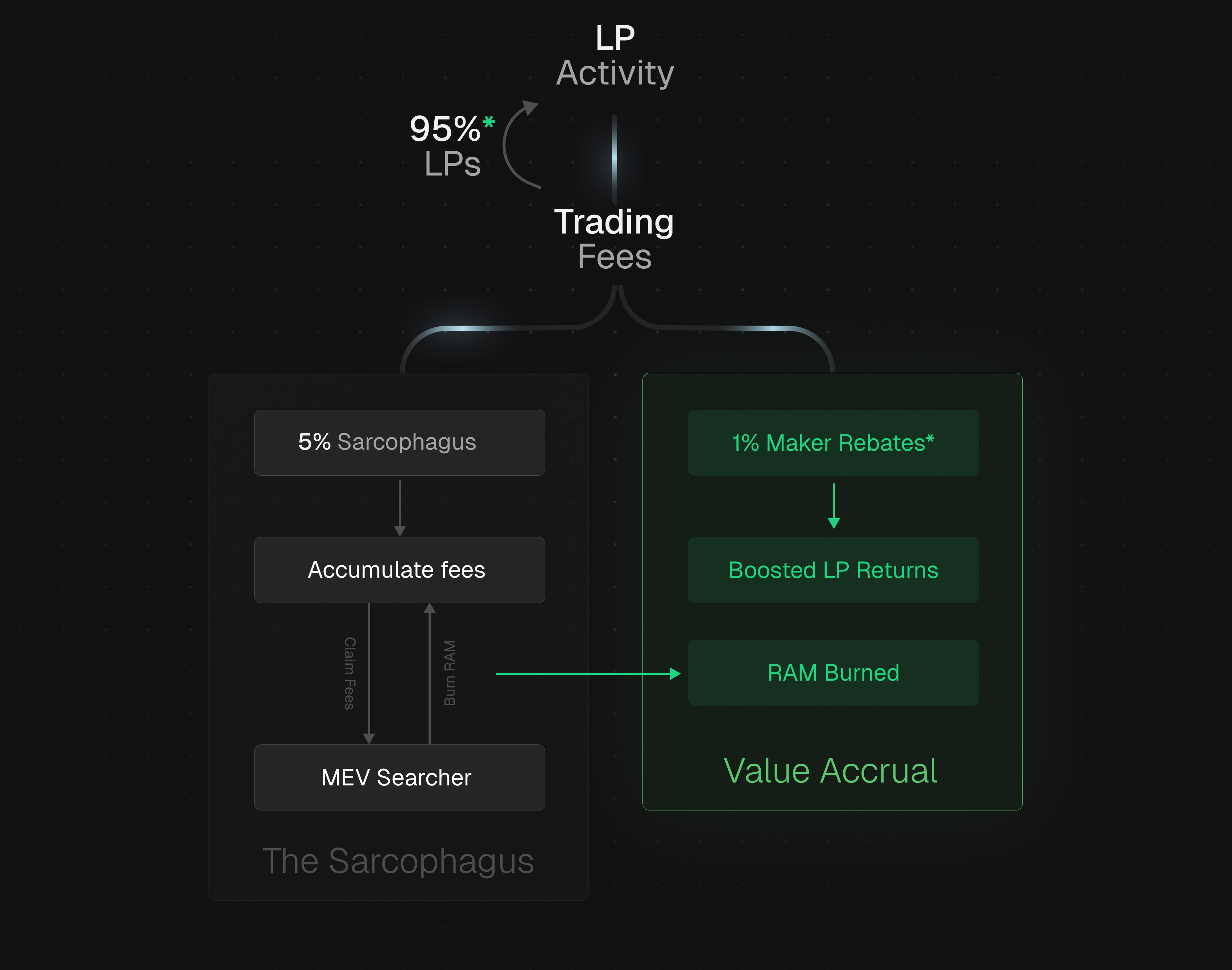 A fixed portion of LP fees flows into the Sarcophagus, creating constant and unavoidable deflationary pressure on RAM.